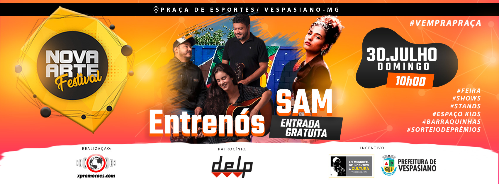 No dia 30 de julho, a partir das 10h, a praça de esportes de Vespasiano será palco de um dos eventos culturais mais esperados da região: o NOVA ARTE Festival. Promovido com os recursos da lei municipal de incentivo à cultura, da prefeitura de Vespasiano, e com o patrocínio da Delp Engenharia, o festival promete proporcionar um dia repleto de entretenimento e arte para toda a família.